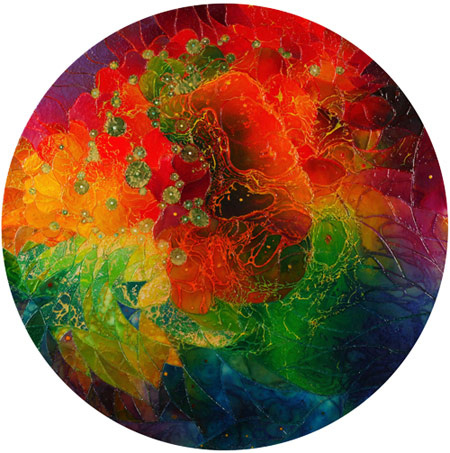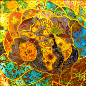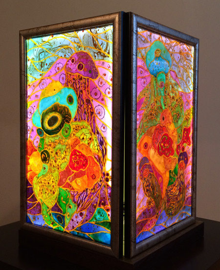 近期畫作𩆜感源自太空星象,海底世界,衆生萬物之神奇奧妙,以綜合媒材潑灑在畫布,木板,玻璃上,再將圖片切割,重組成為Collage Painting, 部份畫作,以LED燈逆光煇映,晶瑩剔透,五彩繽紛,像極教堂彩色玻璃。
